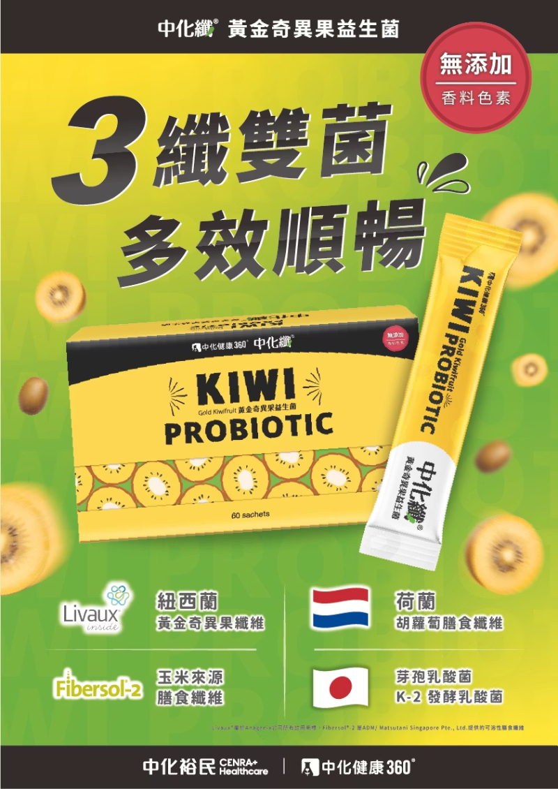 | 主要成份 | 紐西蘭黃金奇異果纖維、荷蘭胡蘿蔔膳食纖維、玉米來源膳食纖維、芽孢乳酸菌、K-2發酵乳酸菌 |